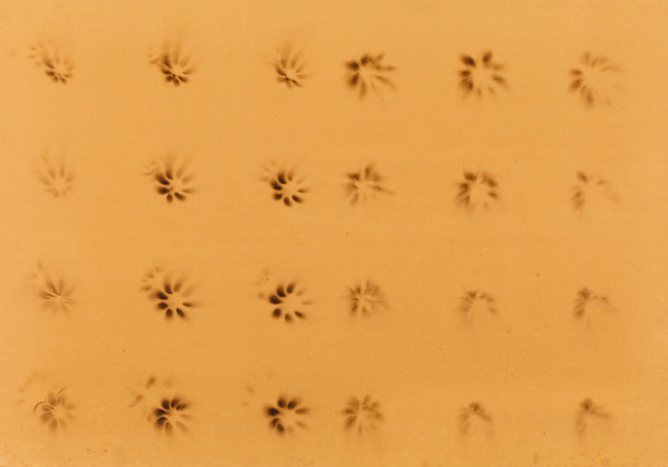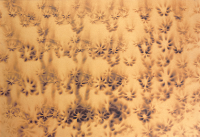 Специально обработанная бумага закреплялась на крыше автомобиля и подвергалась воздействию дождя, ветра и пыли. Попытка перенести на холст стихии.